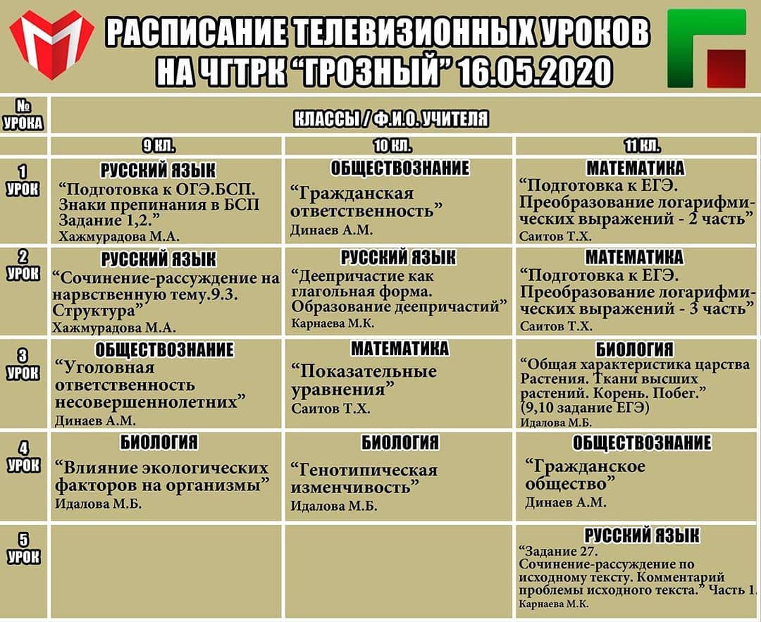 15.05.2020Уважаемые родители!Министерство образования и науки ЧР совместно с ЧГТРК «Грозный» продолжает реализацию проекта «Телешкола»Представляем Вашему вниманию расписание занятий на 16.05.2020.Расписание также опубликованоНа сайте Министерства образования и науки ЧРУроки проходят с 9:00 в эфире ЧГТРК «Грозный».Если вы пропустили ежедневные эфиры, выпуски телепроекта доступны для просмотра на сайте Министерства образования и науки ЧР по ссылке, которая указана в шапке профиля.Следите за обновлением информации на официальном сайте Министерства образования и науки ЧР mon95.ruОставайтесь дома и проводите время с пользой!
