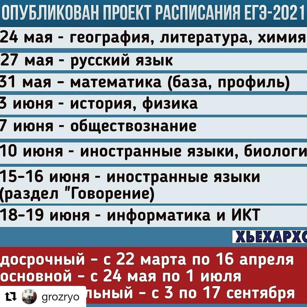 14.10.2020Министерство просвещения опубликовало проект расписания ЕГЭ на 2021 год. По планам, экзамен для выпускников 11-х классов пройдет в три этапа: досрочный - с 22 марта по 16 апреля, основной - с 24 мая по 1 июля, и дополнительный - с 3 по 17 сентября.Основные дни основного этапа:24 мая (понедельник) - география, литература, химия;27 мая (четверг) - русский язык;31 мая (понедельник) - ЕГЭ по математике базового уровня, ЕГЭ по математике профильного уровня;3 июня (четверг) - история, физика;7 июня (понедельник) - обществознание;10 июня (четверг) - иностранные языки (английский, французский, немецкий, испанский, китайский) (за исключением раздела "Говорение"), биология;15 июня (вторник) - иностранные языки (английский, французский, немецкий, испанский, китайский) (раздел "Говорение");16 июня (среда) - иностранные языки (английский, французский, немецкий, испанский, китайский) (раздел "Говорение");18 июня (пятница) - информатика и информационно-коммуникационные технологии (ИКТ);19 июня (суббота) - информатика и информационно-коммуникационные технологии (ИКТ).