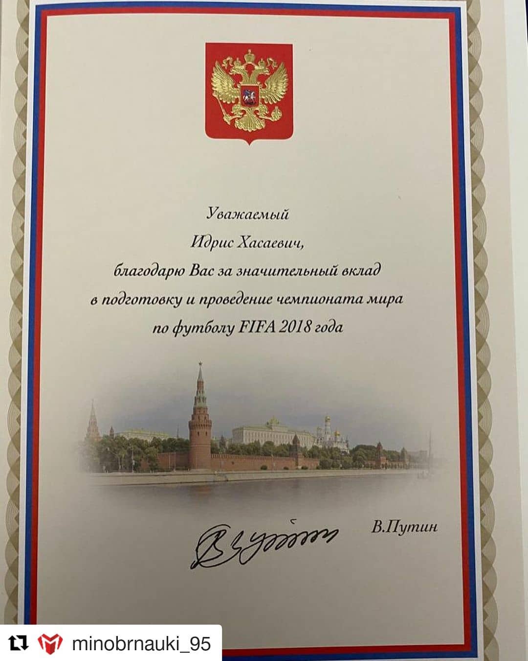 29.10.2020Дорогие друзья!Министр образования и науки Чеченской Республики Идрис Хасаевич Байсултанов получил Благодарственное письмо Президента Российской Федерации Владимира Владимировича Путина «За значительный вклад в подготовку и проведение чемпионата мира по футболу FIFA 2018 года».Отрадно, что старания комиссии республики представлять наше огромное государство в мероприятии мирового международного масштаба отмечаются высшей инстанцией в стране – верховным главнокомандующим.Благодаря особому вниманию Главы Чеченской Республики, Героя России и большого поклонника спорта Рамзана Ахматовича Кадырова организация этого грандиозного мероприятия состоялась на высшем уровне и с учётом всех требований международных норм и спортивных комитетов.Чемпионат мира по футболу 2018 года в России прошёл на высоком организационном уровне и оставил самые приятные эмоции и воспоминания у всех участников!