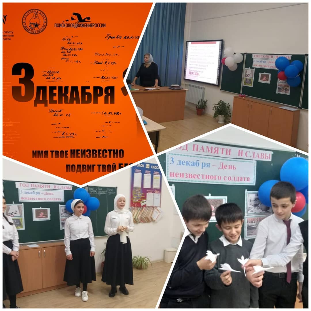 03.12.20203 декабря в МБОУ"СОШ2с.Центора-Юрт"имени А.Х.Кадырова был проведен Всероссийский урок, посвященный Дню неизвестного солдата Занятие началось со слов «Достаточно мгновенья, чтобы стать героем, но необходима целая жизнь, чтобы стать достойным человеком…» Ребята исходя из эпиграфа мероприятия вывели тему мероприятия. Затем их вниманию были представлены два видеоролика, в которых были показаны кадры из документальной хроники об открытие первого памятника Неизвестному солдату. Воспитанники прочли стихотворения, посвященные этой памятной дате. Ребята познакомились с понятиями вечный огонь и Неизвестный солдат. Сделали вывод, что нужно помнить, о тех, кто невернулся с войны. И бережно относиться к этой памяти, а памятники Неизвестному солдату являются отражением благодарности потомков, символом памяти и уважения ко всем погибшим солдатам, чьи останки так и не были идентифицированы.Учащиеся узнали, когда образовалась традиция, по которой в разных странах устанавливались памятники Неизвестному солдату. Минутой молчания почтили память погибших солдат. Ребята под песню «Журавли», увлеченно обсуждали и сделали из бумаги белых журавлей.