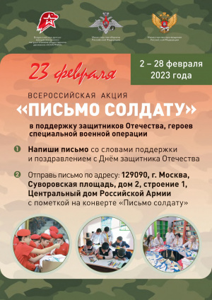 16.02.2023Министерство обороны Российской Федерации совместно с Всероссийским детско-юношеским военно-патриотическим общественным движением «ЮНАРМИЯ» проводится Всероссийская акция «Письмо солдату», приуроченная ко Дню защитника Отечества. Акция продлится до 28 февраля 2023 года.