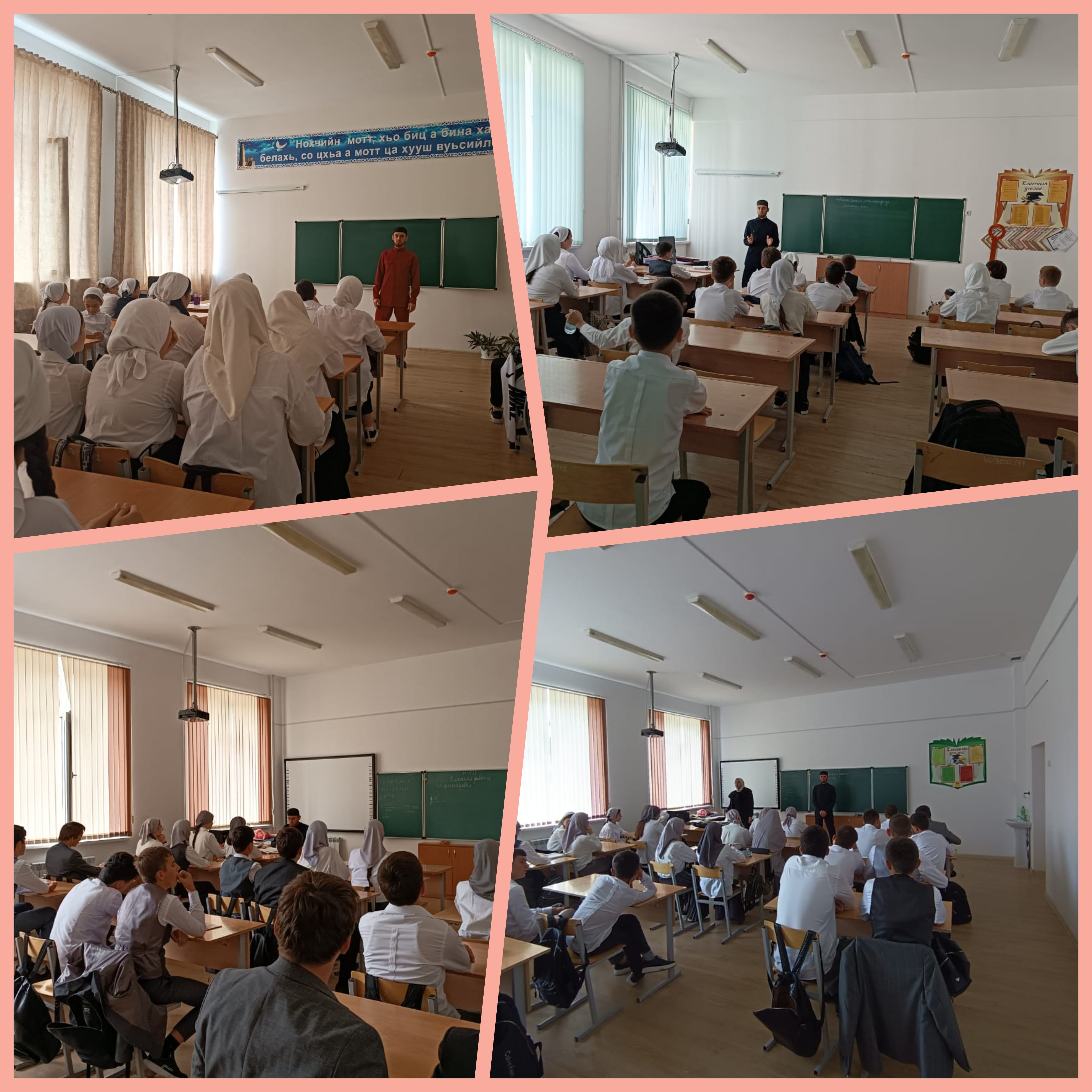 03.10.2023Педагог по ДНВ Белалов М.О. совместно с заместителем директора по ВР Кужуловой М.С-А. провели беседы по классам. В ходе беседы учащимся рассказали о жизни и деятельности Пророка Мухаммада (Да благословит его Аллах и приветствует).