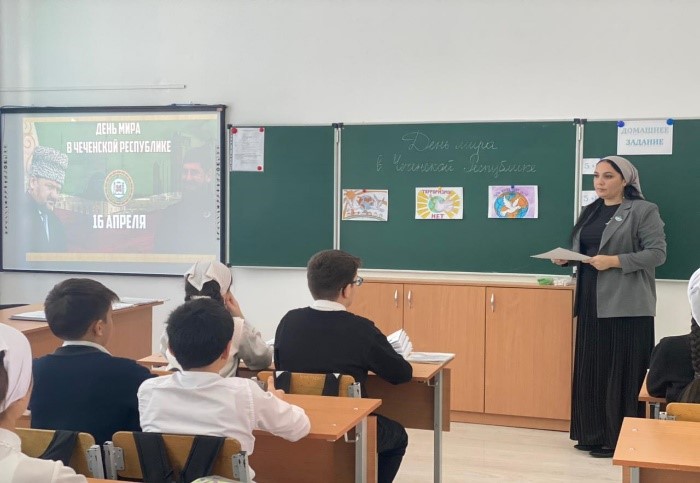 В 5-8 классах прошли классные часы по теме: «День мира в ЧР». Классные руководители рассказали обучающимся какой ценой главе ЧР, герою России, Рамзану Ахматовичу Кадырову удалось добиться отмены КТО в Чеченской республики и что было сделано после отмены КТО на территории Чечни за этот короткий срок. Классные часы сопровождались презентацией, где подробно рассказывалось, и была видна Чеченская Республика до и после отмены КТО.