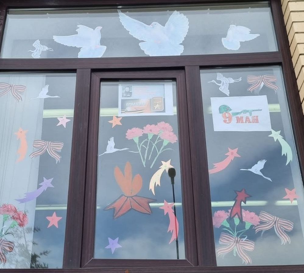 Наша школа ежегодно принимает участие во всероссийской акции "Окна победы". Учащиеся в преддверии праздника 9 мая украшают окна голубями, журавлями, шарами и звездами.